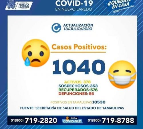 Nuevo Laredo, Tamps.- Pese a los incansables esfuerzos del alcalde Enrique Rivas por ayudar y proteger a la ciudadanía en el municipio de Nuevo Laredo, todo ha sido en vano, pues hasta el día de hoy sobrepasan los mil casos en la entidad. No debemos olvidar que desde que inició la pandemia, hace ya casi 4 meses, Tamaulipas fue de los primeros estados que iniciaron acciones para evitar está situación difícil, pues la población no acató las disposiciones y no respetó la cuarenta.