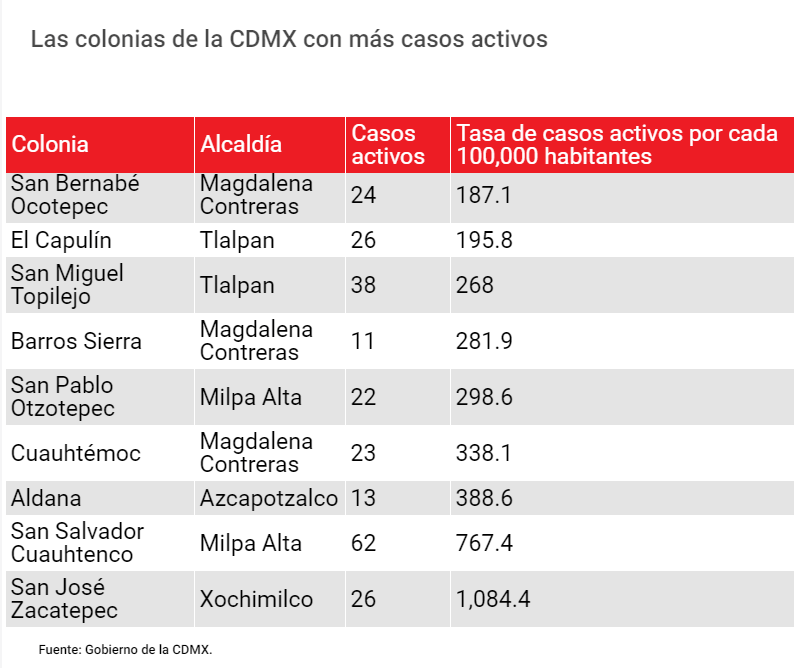 Por tasa de casos activos por cada 100,000 habitantes, el primer lugar lo ocupa San José Zacatepec, en Xochimilco, con un indicador de 1,084.4. Le sigue San Salvador Cuauhtenco, en Milpa Alta, con 767.4, y en tercer lugar está la colonia Aldana, en Azcapotzalco, con 388.6.