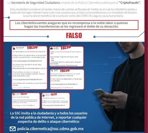 La Secretaría de Seguridad Ciudadana (SSC) de la Ciudad de México, a través de la Policía Cibernética, identificó esta tarde, un hackeo masivo de cuentas verificadas de Twitter, en el cual los ciberdelincuentes por medio de distintos mensajes intentan hacer creer a los usuarios que, al hacer una transferencia a un monedero de bitcoins la suma será en beneficio de la lucha en contra del COVID-19 o de alguna causa humanitaria.