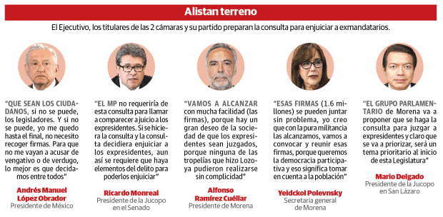 Cierran filas para impulsar consulta que plantea el Presidente; Ramírez Cuéllar y Polevnsky van por convocatoria para cumplir requisito; en diputados, Mario Delgado promete pedir realización del ejercicio; Ricardo Monreal señala que se pueden enjuiciar si hay pruebas