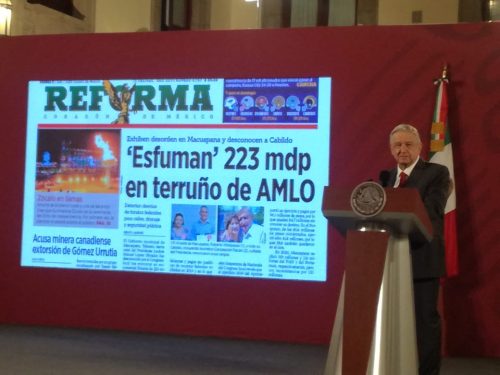 -Ah, lo de Macuspana. Miren Reforma, un pasquín inmundo, a ocho columnas. Con todo mi respeto a los trabajadores, reporteras, reporteros, camarógrafos, trabajadores de los talleres, me estoy refiriendo que es un pasquín inmundo de los de mero arriba, porque es protector, patrocinador de Carlos Salinas de Gortari.