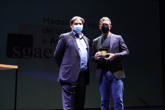 Con la Medalla de Honor, máxima distinción que otorga la entidad, la SGAE agradeció a Antonio Banderas “su extraordinaria contribución a la cultura de su tiempo y su valiosa representación del talento artístico español en todo el planeta”.