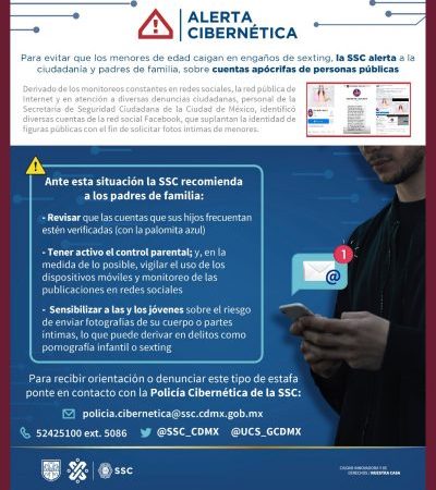 Además, llama a los padres y adultos en general a sensibilizar a las y los jóvenes sobre el riesgo de enviar fotografía de su cuerpo o partes íntimas, lo que puede derivar en delitos como pornografía infantil o sexting. La Secretaría de Seguridad Ciudadana invita a la población a acercarse a la Policía Cibernética, para recibir orientación y aclarar cualquier duda, así como para reportar actividades sospechosas que detecten en su navegación por la red pública de Internet y pone a disposición el teléfono 5242 5100 Ext. 5086, el correo electrónico policia.cibernetica@ssc.cdmx.gob.mx, o las cuentas de redes sociales @SSC_CDMX y @UCS_GCDMX.