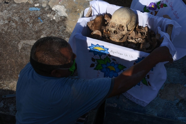 Esta actividad consiste en que un integrante de cada familia se encarga de sacudir el polvo que se acumula en los recipientes donde se guardan los huesos de los santos difuntos; posteriormente se cambian a una manta grande, la cual le sirve de vestido, también conocido como Le Kéex Nok, regularmente interviene toda la familia para que posteriormente, años más adelante, los niños continúen con este ritual ancestral.