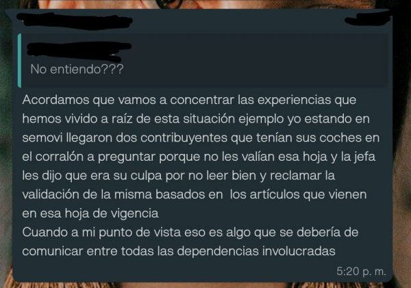 Lo cierto es que, ante la inoperatividad del sistema, los ciudadanos afectados han tenido que arriesgarse a salir de sus casas para acudir a las oficinas de Álvaro Obregón e Insurgentes para buscar ayuda, y como respuesta ante sus interrogantes sólo han recibido maltratos de empleados y directivos. Eso sin contar con la extorsión de agentes policiales que, ante la falta de tarjeta de circulación o placas, encuentran el pretexto ideal para amenazar a los conductores.