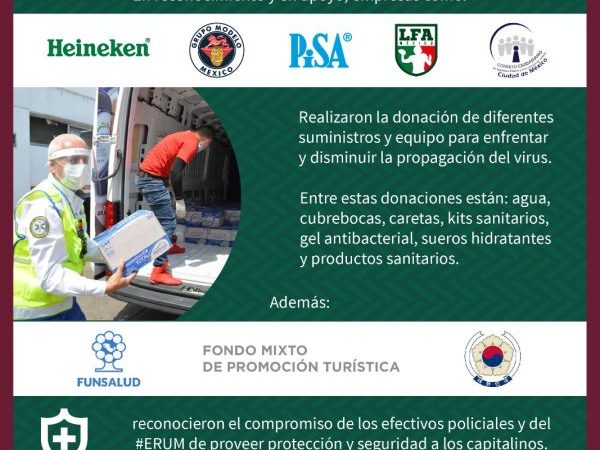 Por ello, en reconocimiento, agradecimiento y apoyo a las y los policías de la SSC, empresas cerveceras como Heineken México y Grupo Modelo; la Farmacéutica Pisa; la Liga de Fútbol Americano Profesional de México (LFA); el Consejo Ciudadano para la Seguridad y Justicia; y la Embajada de Corea, entre otras, realizaron la donación en especie de botellas de agua y agua mineral, cubrebocas, caretas, kits sanitarios, termómetros, entre otros artículos y productos sanitarios.