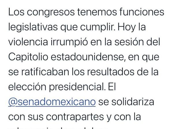 “Los congresos tenemos funciones legislativas que cumplir. Hoy la violencia irrumpió en la sesión del Capitolio estadounidense, en que se ratificaban los resultados de la elección presidencial. El Senado mexicano se solidariza con sus contrapartes y con la relevancia de su labor”.