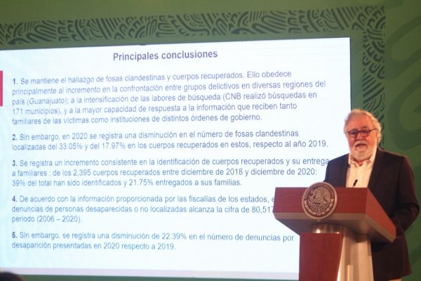 Encinas Rodríguez presentó diez conclusiones de su informe anual de las labores de búsqueda de personas desaparecidas en el que registra un incremento consistente en la identificación de cuerpos recuperados y su entrega a familiares de los 2 mil 395 cuerpos recuperados entre diciembre de 2018 y diciembre de 2020.