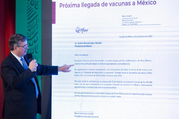 Durante la conferencia de prensa en Palacio Nacional, el canciller Marcelo Ebrard Casaubón presentó en la pantalla la carta de la ejecutiva de Pfizer, en la que se refiere que existe un convenio de fabricación y suministro con la Secretaría de Salud por un total de 34.4 millones de dosis para 2021.