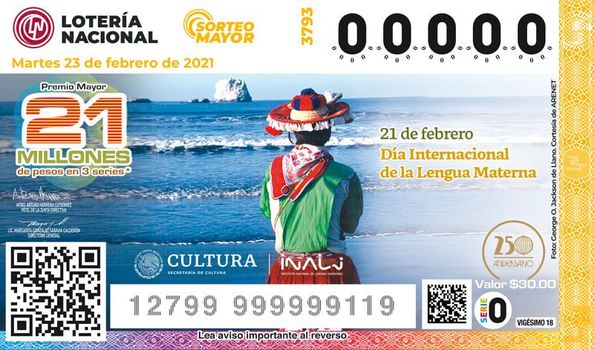 En el marco del Día Internacional de la Lengua Materna, que se conmemora el 21 de febrero, la Lotería Nacional y la Secretaría de Cultura del Gobierno de México, a través del Instituto Nacional de Lenguas Indígenas (INALI), llevaron a cabo, en formato virtual, la develación del billete del Sorteo Mayor No. 3793, que lleva en su imagen una ejemplificación alusiva a este día, el cual fue declarado así en 1999 por la Organización de las Naciones Unidas para la Educación, la Ciencia y la Cultura (UNESCO).