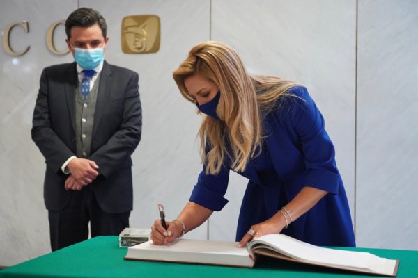 Después de la reunión la señora Fabiola Andrea Yáñez firmó el libro de visitantes distinguidos, junto al busto del Benemérito de las Américas, Benito Juárez García. En este acto solemne la acompañó el director general del IMSS, Zoé Robledo.