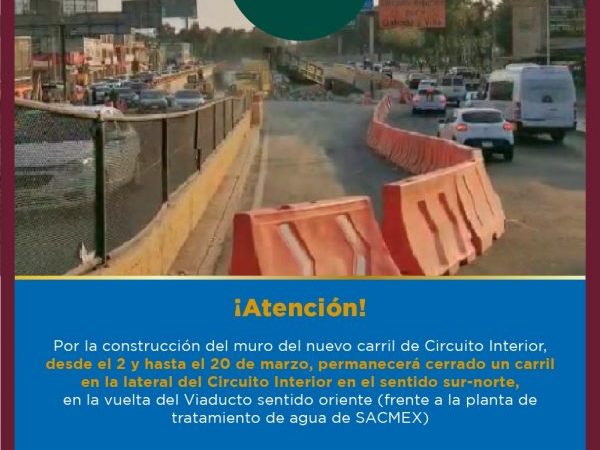 • Del martes 2 al jueves 4 de marzo, se realizará un corte en el cuerpo sur del Viaducto Río de la Piedad, en el sentido Poniente – Norte.