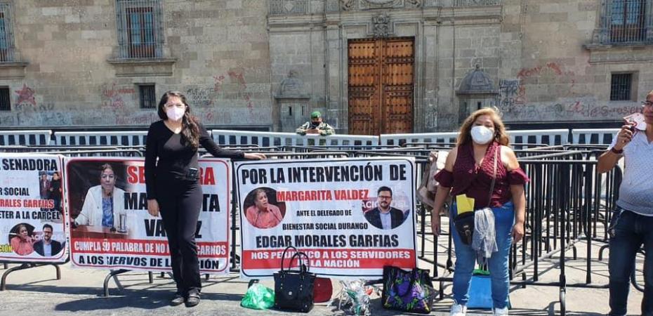 Ante la negativa a ser reubicados, ex trabajadores de la Secretaría de Bienestar en Durango, viajaron hasta la Ciudad de México para manifestarse frente a Palacio Nacional y pedir al gobierno federal su intervención para resolver su situación, así como de atender las denuncias de corrupción al interior de esta secretaría, motivo por el cual fueron despedidos.
