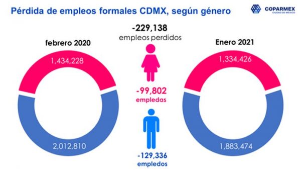 En la Ciudad de México, cerca de 100 mil mujeres dejaron o perdieron su empleo formal, según cifras del Instituto Mexicano del Seguro Social. La tasa de pérdida de empleo respecto a los empleos registrados en febrero de 2020 (fecha en que se registró el primer caso COVID19 en nuestro país) fue para 6.95% para las mujeres mientras que de 6.43% para los hombres.