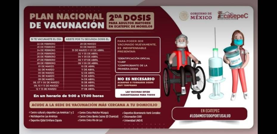 Las personas que fueron vacunadas entre el 22 de febrero y el 1 de marzo deberán presentarse entre mañana 29 de marzo y el 10 de abril en los módulos siguientes en un horario de 9:00 a 17:00 horas: Centro Cultural Las Américas I y II, Deportivo Las Américas, Deportivo Ejidal Emiliano Zapata, Centro Cívico Melchor Múzquiz, Centro Cívico Benito Juárez (El Chamizal), Centro Cívico Río de Luz, Deportivo Bicentenario Hank González, Chiconautlán 3000 y Universidad Estatal del Valle de Ecatepec (UNEVE).