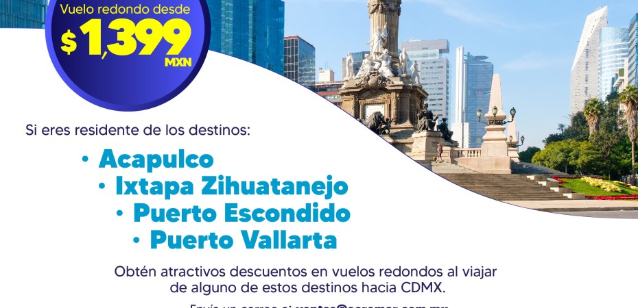 *Aeromar ofrece tarifa especial a los residentes de Acapulco, Ixtapa Zihuatanejo y Puerto Escondido que viajen a Ciudad de México y de Puerto Vallarta hacia Guadalajara.