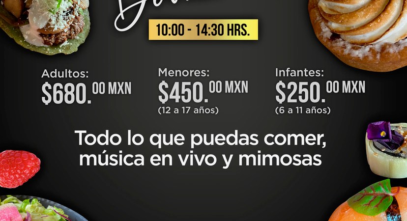 Por este y varios motivos, es suficiente pretexto para aprovechar la promoción que el restaurante anuncia; un Brunch Dominical que se lleva a cabo de 10:00 a 14:30 hrs. invitando a toda la gente a comer todo lo que pueda y disfrutar del ambiente con música en vivo y Mimosas.