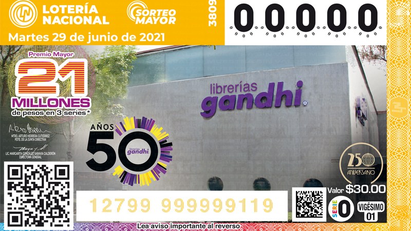 Librerías Gandhi tiene una promoción esta semana y hasta el día del sorteo, en la compra de $500 pesos en libros, está obsequiando un billete de lotería con la imagen de su 50 aniversario (hasta agotar existencias y en librerías participantes).
