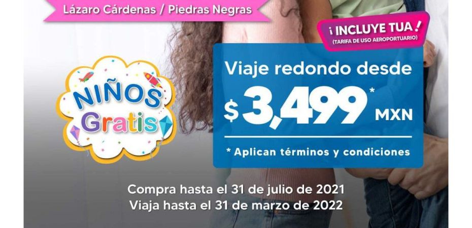 Adquiriendo los vuelos hasta el 31 de julio para las rutas de Piedras Negras, Lázaro Cárdenas, Ixtepec y Ciudad Victoria, los niños van por nuestra cuenta hasta el 31 de marzo de 2022.