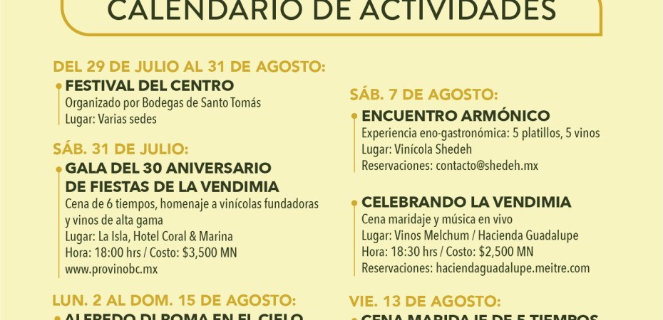 Ante la amenaza de un nuevo brote de COVID, así como en apoyo a medidas que marca la Secretaría de Salud de Baja California en relación con los eventos masivos y, sobre todo, siendo responsables con la seguridad de nuestros visitantes, staff y en general de todo el personal que labora en el sector, Provino modificó el anunciado sobre Fiestas de la Vendimia 2021. El calendario de actividades quedará de la siguiente manera: