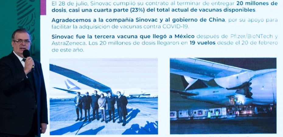 Por otra parte, el secretario informó que el pasado 28 de julio nuestro país concluyó el contrato con la farmacéutica Sinovac, por lo que agradeció a la empresa y al gobierno de China por su apoyo y disposición para cumplir lo acordado en tiempo y forma. Sinovac fue la tercera vacuna que llegó a México, proporcionando 20 millones de dosis que fueron transportadas en un total de 19 vuelos, que iniciaron el 20 de febrero del presente año y concluyeron la semana pasada.
