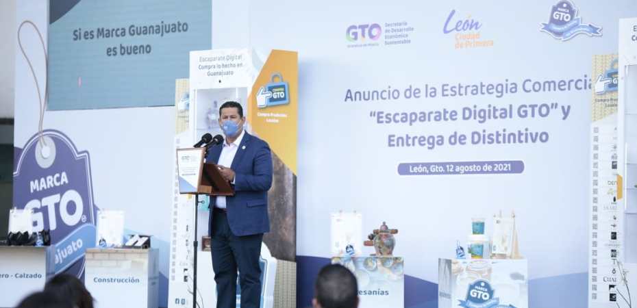 León, Gto. 12 de agosto de 2021.- Al encabezar el anuncio de la Estrategia Comercial “Escaparate Digital GTO” y la entrega de 100 Distintivos Marca GTO; el Gobernador, Diego Sinhue Rodríguez Vallejo, reiteró su respaldo a las micro, pequeñas y medianas empresas que son el motor del desarrollo del estado.