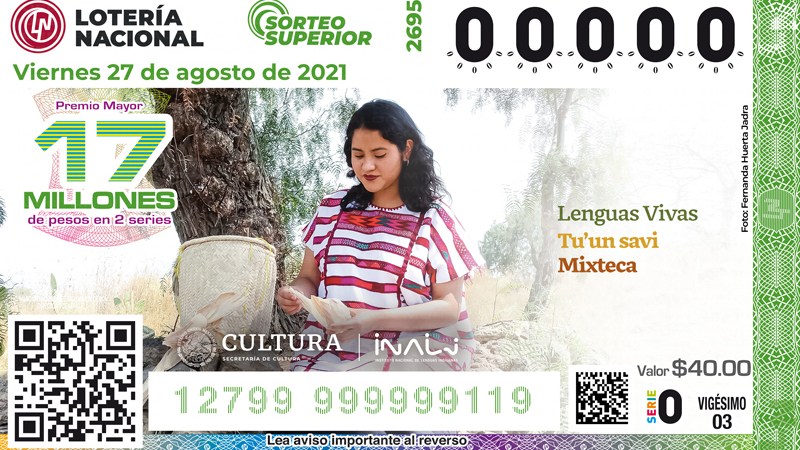 En coordinación con la Secretaría de Cultura, a través del Instituto Nacional de Lenguas Indígenas (INALI), la Lotería Nacional develó el billete del Sorteo Superior No. 2695, alusivo a las Culturas Vivas INALI, Mixteca, que difunde la riqueza lingüística del país y donde se plasma a Nadia López García, ejemplar poeta de la tradición y herencia mixteca.