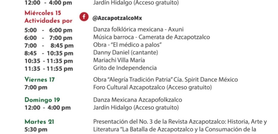En días posteriores se realizarán eventos en diversas sedes de la alcaldía, de forma presencial, cuidando en todo momento las medidas sanitarias pertinentes como uso de gel antibacterial🧼, toma de temperatura 🤒al ingresar a algún recinto, guardar sana distancia🔛, uso obligatorio de cubrebocas 😷y un cupo máximo de en los recintos a los cuales se acuda. El viernes 17 de septiembre, a las 7 pm, las celebraciones continúan con la obra “Alegría Tradición Patria” interpretada por la Compañía Spirit Dance México en el Foro Cultural Azcapotzalco. La entrada será libre y el aforo estará limitado al 50%. El domingo 19 de septiembre en el Jardín Hidalgo, al aire libre habrá Danza Mexicana “Azcapofolkzalco” a las 7 pm.