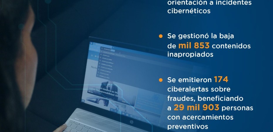 Estas acciones han permitido que, del 1 de agosto de 2020 al 31 de julio de 2021, se realizaron 39 mil 935 acciones de orientación a incidentes cibernéticos; se gestionó la baja de mil 853 contenidos inapropiados y se emitieron 40 noticias criminales para informar a otras instancias sobre conductas posiblemente ilícitas.