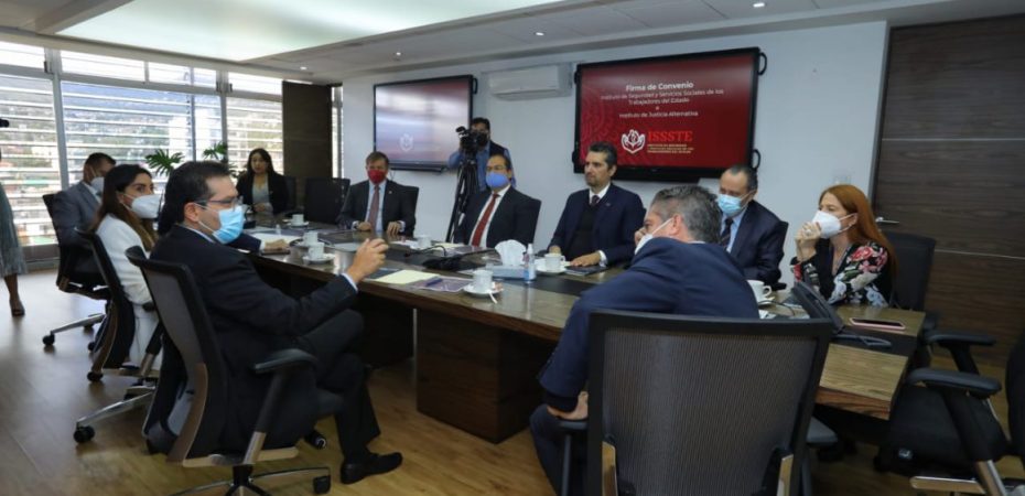 El director general del Instituto de Seguridad y Servicios Sociales de los Trabajadores del Estado (ISSSTE), Luis Antonio Ramírez Pineda, y el titular del Instituto de Justicia Alternativa del estado de Jalisco (IJA), Guillermo Raúl Zepeda Lecuona, firmaron un convenio a través del cual se implementarán métodos de solución de conflictos en las unidades médicas, con el fin de disminuir las quejas por el trato, evitar se generen demandas y cumplir el objetivo de mejorar la atención que se brinda a la derechohabiencia.