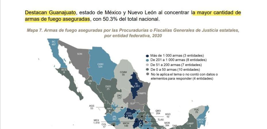 • Guanajuato, Estado de México ¿será? y Nuevo León son los tres estados que concentran la mayor cantidad de armas aseguradas; con más de 1 mil armas, según el reporte del INEGI.