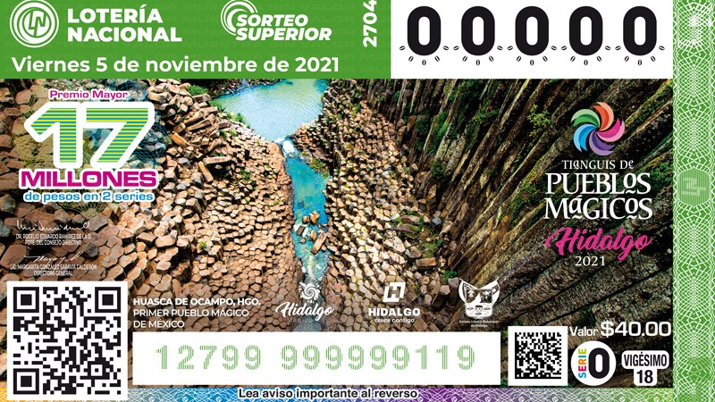 En apoyo a la promoción turística de México, la Lotería Nacional develó el billete del Sorteo Superior No. 2704, alusivo al Tianguis de Pueblos Mágicos 2021, que tendrá como sede el estado de Hidalgo y, ofrecerá en formato digital, un escaparate para posicionar la identidad cultural, histórica y gastronómica de nuestro país.
