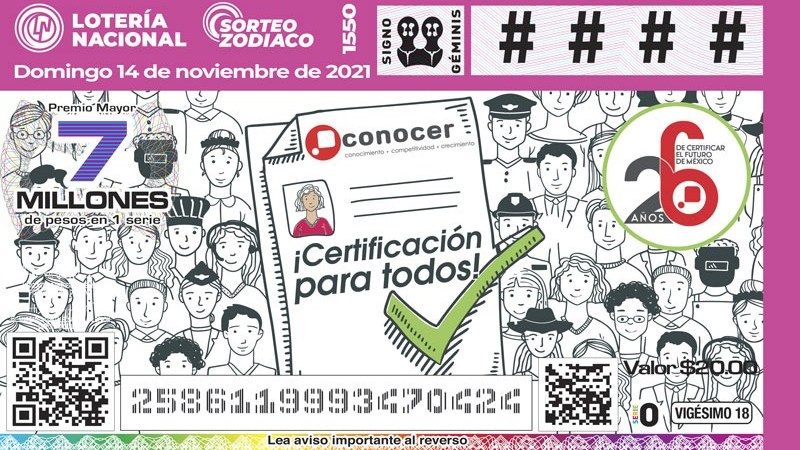 El Consejo Nacional de Normalización y Certificación de Competencias Laborales (Conocer) y la Lotería Nacional presentaron el billete conmemorativo al 26º aniversario de este organismo, dependiente de la Secretaría de Educación Pública (SEP), bajo el lema 26 años de certificar el futuro de México, el cual promueve el reconocimiento y la certificación de competencias laborales.