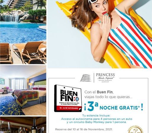 Para la edición 2021 del Buen Fin, los hoteles de la Riviera Diamante Acapulco, Princess, Pierre y Palacio Mundo Imperial, que cuentan con los más altos estándares de calidad y servicio para todos los turistas nacionales e internacionales, dan a conocer sus tarifas y accesos especiales durante la temporada: