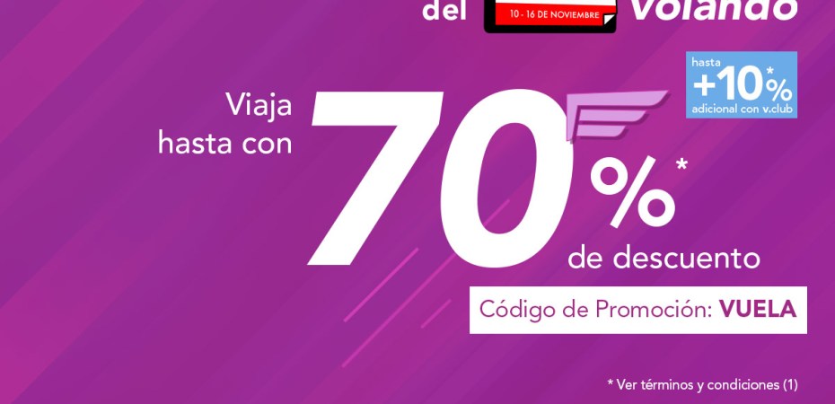 (1) Viajes nacionales e internacionales hasta con 70% de descuento aplicable únicamente a la tarifa aérea y sujeto a disponibilidad. Hasta el 10% adicional con v.club. Aplica únicamente en reservación básica y clásica. No aplica en TUA, impuestos ni servicios adicionales. Compra del 15 de noviembre de 2021 al 16 de noviembre del 2021, para viajar del 15 de noviembre de 2021 al 31 de marzo de 2023. No aplica en grupos mayores a 10 personas. Promoción válida solo comprando en volaris.com. Consulta los cargos por equipaje, otros servicios y cargos opcionales.PARA VUELOS NACIONALES E INTERNACIONALES, si adquiriste la reservación básica solo incluye un objeto personal, cuya medida no exceda 35x45x20 cm (que quepa debajo del asiento frente a ti). Adquiriendo la reservación clásica incluye un objeto personal, cuya medida no exceda 35x45x20 cm (que quepa debajo del asiento frente a ti) más una maleta de mano cuya medida no exceda 55x40x25 cm y que no exceda 10 kg. Adquiriendo la reservación plus incluye un objeto personal, cuya medida no exceda 35x45x20 cm (que quepa debajo del asiento frente a ti), dos maletas de mano cuyas medidas no excedan 55x40x25 cm y que no excedan 10 kg entre ambas piezas, más una maleta documentada de 158 cm lineales totales que no exceda 25 kg.