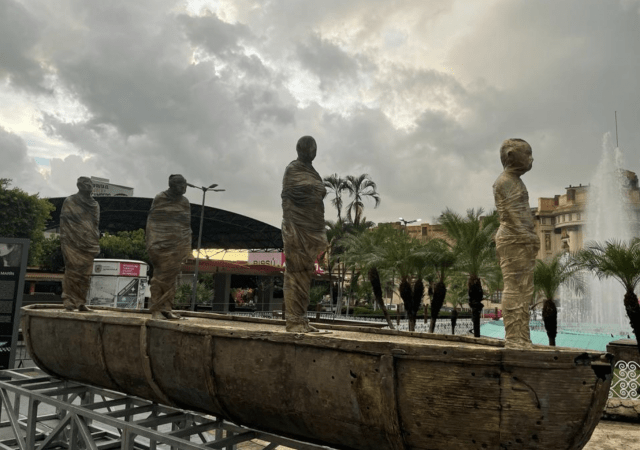 En esta pieza del escultor mexicano Jorge Marín, el esplendor del bronce magnifica una escena de corte surrealista. Se trata de una balsa que parte con rumbo desconocido; a bordo de ella se encuentran varios tripulantes que van hacia un nuevo destino. Sus cuerpos permanecen de pie, envueltos casi en su totalidad por una tela drapeada. Los pies, única parte de los cuerpos totalmente visible, se encuentran firmemente apoyados sobre la barca, que luce inconmovible y sólida a pesar de las señales del tiempo y de la navegación imaginaria sobre su casco. Originalmente eran tres los cuerpos que se erguían en la balsa, dos masculinos y uno femenino, pero, en el contexto del 75 Aniversario de UNICEF este año, Jorge Marín, Embajador de la organización, agregó una figura más, la de un niño, dotando así a la obra de mayor fuerza expresiva.