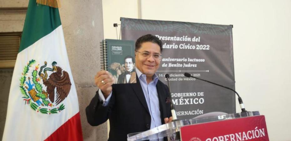 El subsecretario de Desarrollo Democrático, Participación Social y Asuntos Religiosos de la Secretaría de Gobernación, Rabindranath Salazar Solorio, presentó de manera oficial el Calendario Cívico 2022, edición que está dedicada a Benito Juárez García, en el marco de su 150 aniversario luctuoso.
