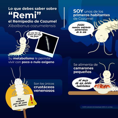 Su nombre científico es Xibalbanus cozumelensis, mejor conocido en la comunidad científica como “RemI”, el Remipedio de Cozumel. Es endémico y se calcula que apareció hace 542 millones de años en la era del carbonífero en el periodo paleozoico y no ha cambiado su forma desde entonces, detalló Germán Yáñez Mendoza, espeleólogo con décadas de experiencia.