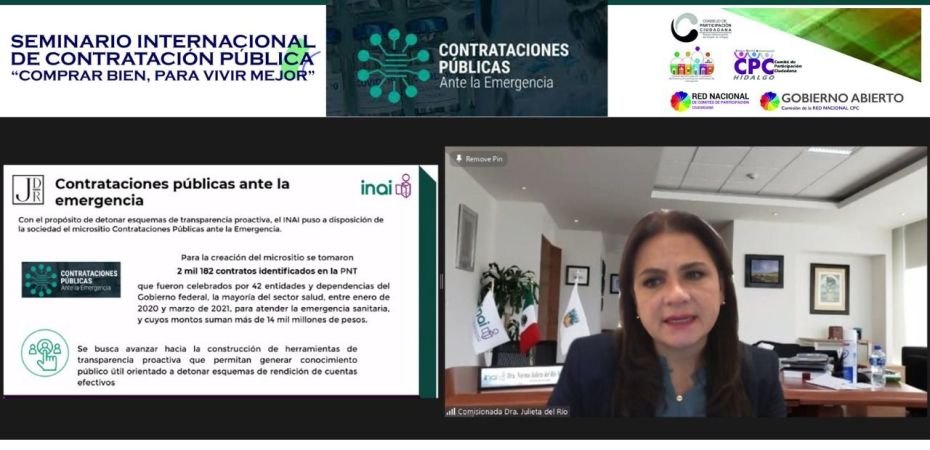 Para disminuir el riesgo de corrupción en la adquisición de bienes y servicios públicos, es necesario fomentar la participación de la figura de testigo social; contar con datos e información oportuna y accesible relacionada con sanciones y multas, y profesionalizar a las personas servidoras públicas a cargo de los procesos de contratación, consideró Norma Julieta del Río Venegas, Comisionada del Instituto Nacional de Transparencia, Acceso a la Información y Protección de Datos Personales (INAI).
