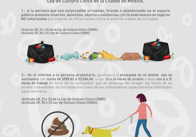 Lo anterior es por motivos de higiene, salud pública y sana convivencia, de tal suerte que hizo un llamado a los más de 550 mil habitantes y más de 6 millones de visitantes diarios a respetar la Ley de Cultura Cívica de la Ciudad de México en sus articulados 28, 29, 30, 31 y 32, para lograr un entorno limpio en la Alcaldía Cuauhtémoc.