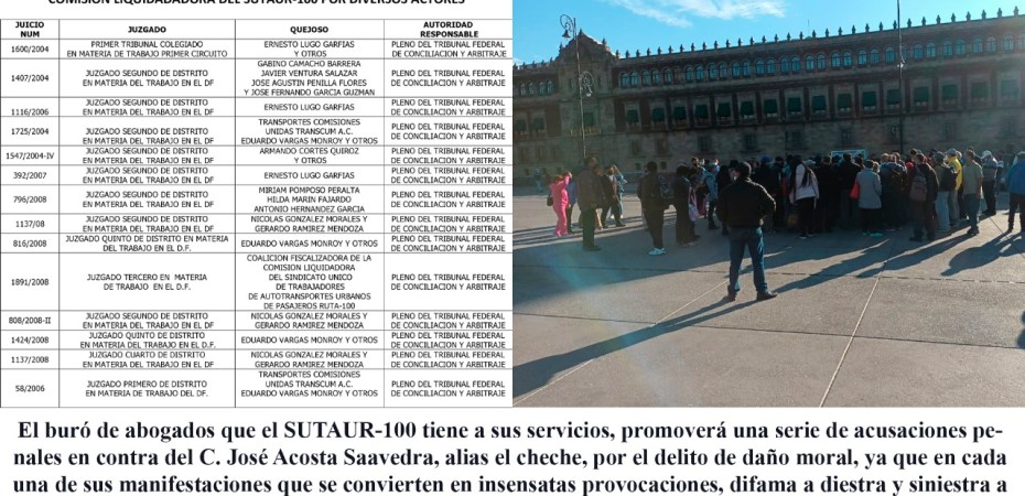 El buró de abogados que el SUTAUR-100 tiene a sus servicios, comentó, promoverá una serie de acusaciones penales en contra del C. José Acosta Saavedra, alias el cheche, por el delito de daño moral, ya que en cada una de sus manifestaciones que se convierten en insensatas provocaciones, difama a diestra y siniestra a la dirigencia de la ex Ruta 100, sin presentar pruebas que fundamenten sus insustanciales dichos.