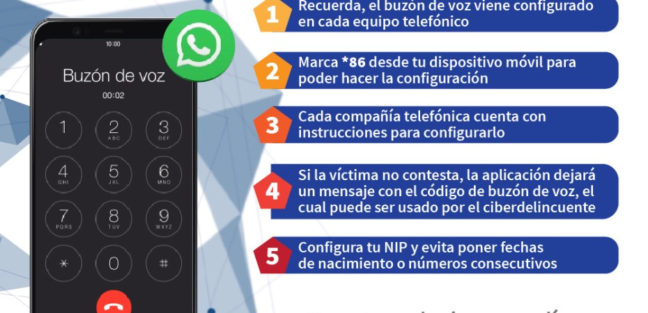 Derivado de un trabajo de investigación y en atención a diversas denuncias ciudadanas, la Policía Cibernética de la SSC detectó que un buzón de voz sin configuración podría ser la puerta para que un cibercriminal acceda a la información de la aplicación de mensajería instantánea de la víctima.
