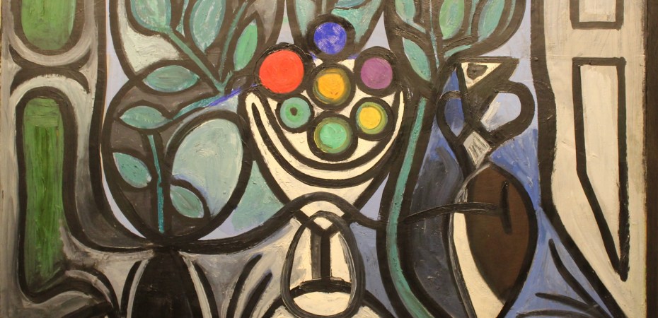 los grandes temas, grandilocuentes, y prefieren dibujar lo que es tangible y tienen a su alrededor. Esta naturaleza muerta representa un frutero con siete piezas de fruta de diversas tonalidades, que hacen pensar más en el pincel de Vilató que en el de Picasso, salvo por la imagen que se recrea a la derecha del cuadro y en la que se puede ver”.