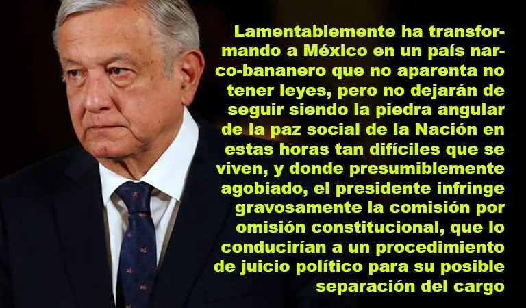 “Lamentablemente ha transformando a México en un país narco-bananero que no aparenta no tener leyes, pero no dejarán de seguir siendo la piedra angular de la paz social de la Nación en estas horas tan difíciles que se viven, y donde presumiblemente agobiado, el presidente infringe gravosamente la comisión por omisión constitucional, que lo conducirían a un procedimiento de juicio político para su posible separación del cargo”, urgió.