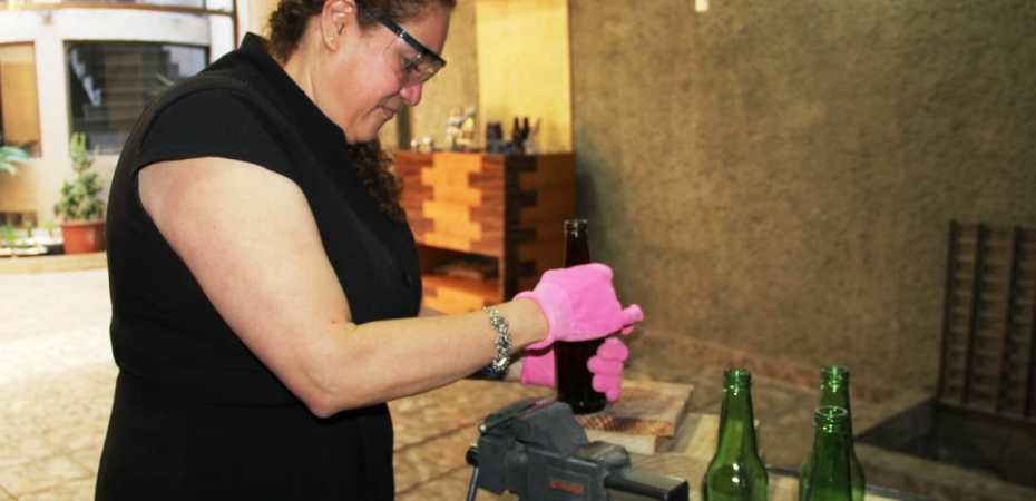 Susana recicla todo tipo de pedacería de vidrio, “no hay merma, nada se desperdicia. Puede ser la botella de cerveza o vino, todo se tritura, incluso mis vecinos me regalan vasos o ventanas rotas. Para ello, hay un proceso: limpiar el vidrio, separar, cortar, introducirlo al horno y realizar el lienzo”, explica.