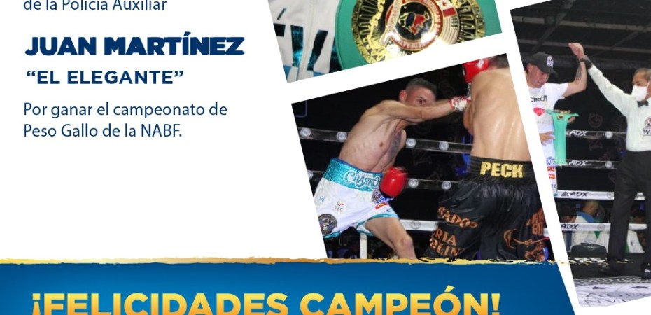 Resultado de la intensa preparación, dedicación y esfuerzo, el Policía Auxiliar Juan Francisco Martínez Ayala, conocido en el pugilismo como «El Elegante», quien tiene 10 años de antigüedad en la Corporación, se convirtió en campeón en la categoría de Peso Gallo, cinturón otorgado por la Federación Norteamericana de Boxeo (NABF) del Consejo Mundial de Boxeo.