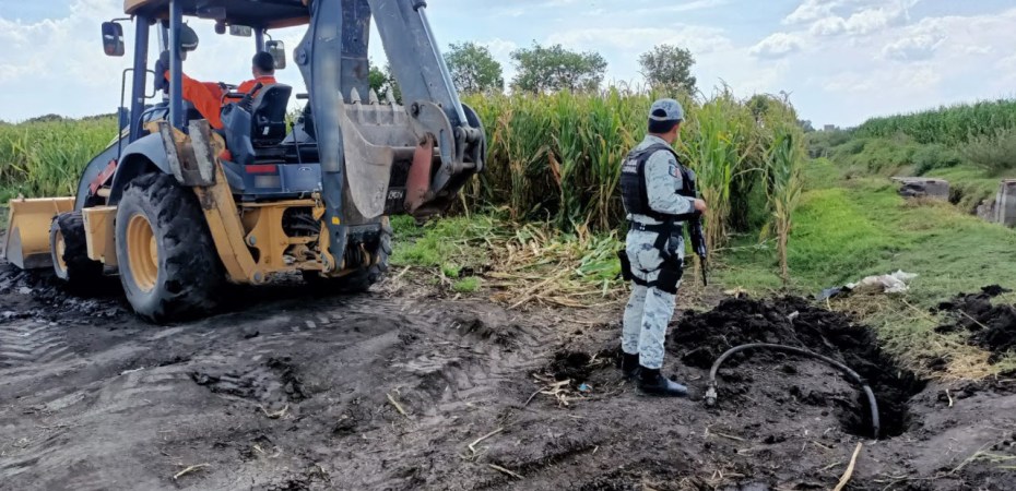 Un hallazgo más fue en el municipio de Huichapan, en un terreno de cultivo de maíz, donde personal de la Guardia Nacional localizó una toma clandestina para sustracción de combustible conectada al poliducto Tula-Salamanca.