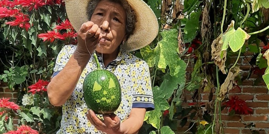 Como su huerto lo tiene en su casa, los vecinos desde hace 45 años acuden por sus chilacayotes, por lo que pueden escoger y cortar su propio fruto. Además, explica la joven productora Ariadne Mitzi Pastor Muñoz, “ayudamos a elaborar su cráneo, que va desde el tradicional con ojos de triángulos y grecas, hasta los que le piden de un súper héroe”.