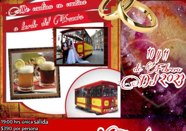 Una experiencia romántica y divertida para celebrar el día de “San Valentín”. Una boda de (“a mentis”). El lema del recorrido: “Cásate con quien tú quieras”. Bienvenida la comunidad LGBTI+. “Cásate Conmigo de Cantina en Cantina a bordo del Tranvía” es un recorrido para todos, todas y todes.