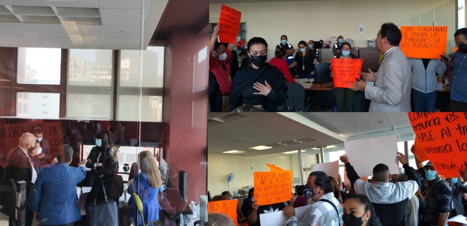 Con pancartas en mano, gritando diversas consignas, se manifestaron al interior del juzgado 1º. Familiar, para exigir respeto a sus derechos humanos y laborales, y acusaron que no obedecen a los códigos de ética cuando, como lo ha afirmado el presidente magistrado Guerra Álvarez, “las y los jueces estamos destinados a liderar, convocar e inspirar…